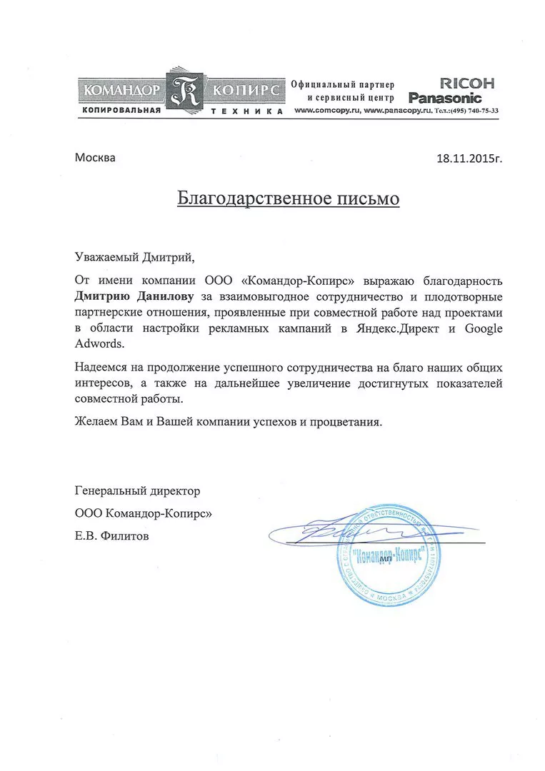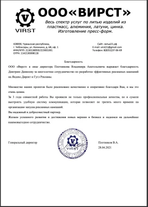 Прошло уже достаточное время для подведения итогов и определения эффективности работы маркетолога, поэтому могу написать отзыв. Данилова Дмитрия мне рекомендовал мой знакомый, поэтому я смело обратилась к нему и мы начали сотрудничество с настройки Яндекс Директ. Дмитрий настроил рекламу очень грамотно, каждый звонок и клик целевой, соответственно вырос трафик и повысилась отдача от рекламы. Затем он настроил ГУГЛ ЭДВОРДС, тут он тоже выполнил работу профессионально. И еще подключил сервис для отслеживания звонков с рекламы. Цены на услуги адекватные, всегда на связи, всегда держит в курсе, какие показатели, что исправляем, над чем работаем. Вносит правки по сайту. Рекомендую его своим знакомым и надеюсь на дальнейшее плодотворное сотрудничество.